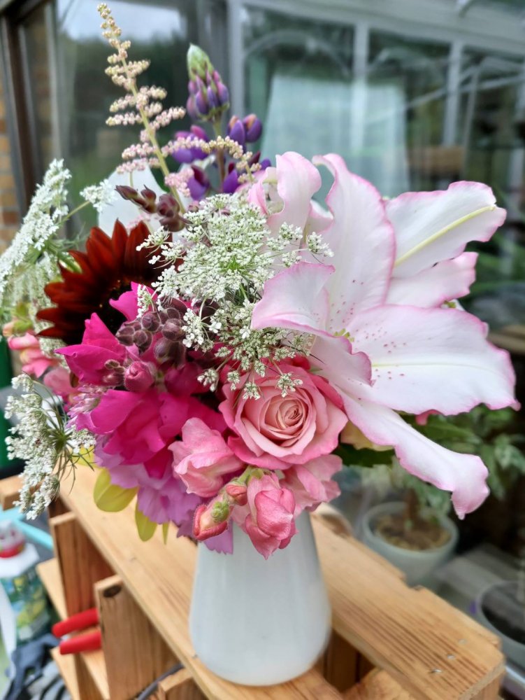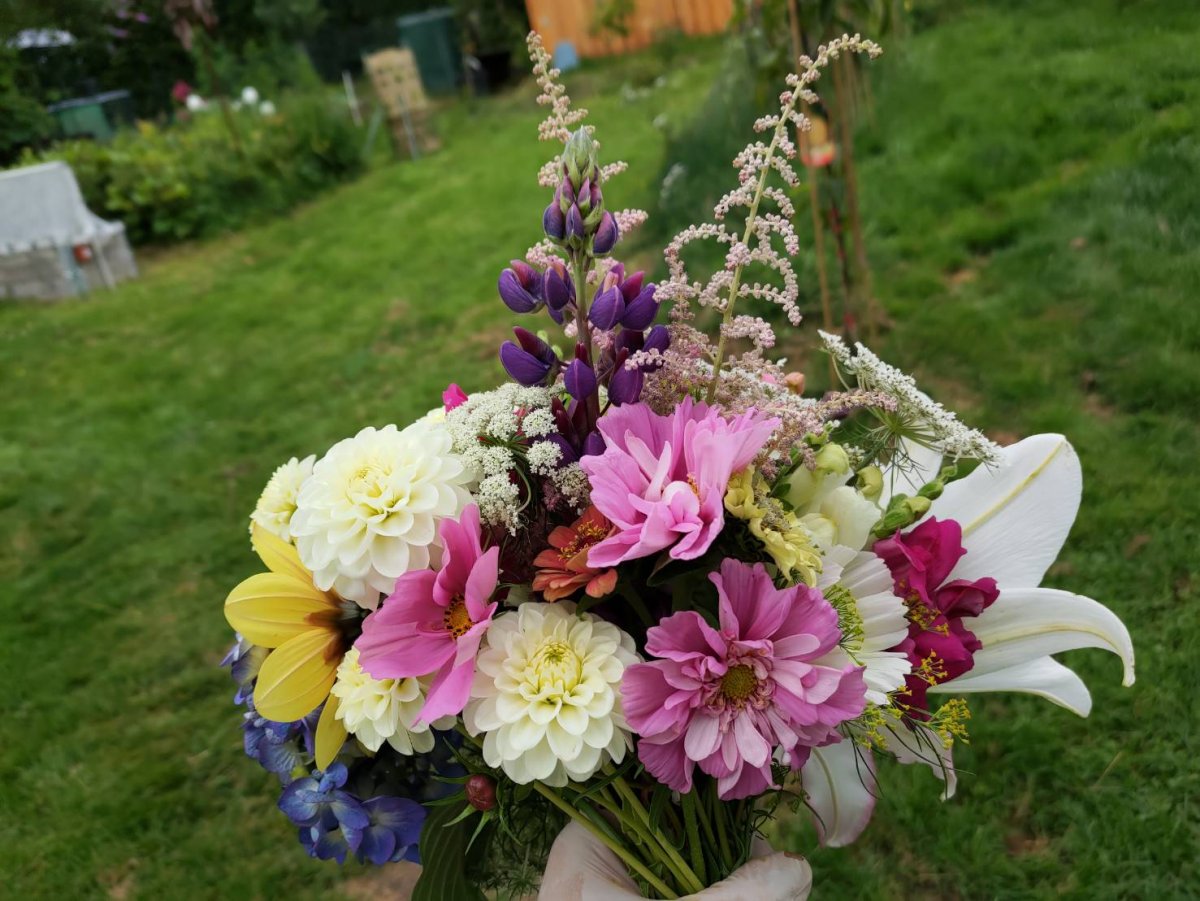 Walked around in the garden, harvested flowers and arranged bouquets. This one for the neighbor who volunteers to help us cut hedge (we are still practicing, hahaha). We love this elder couple very much.