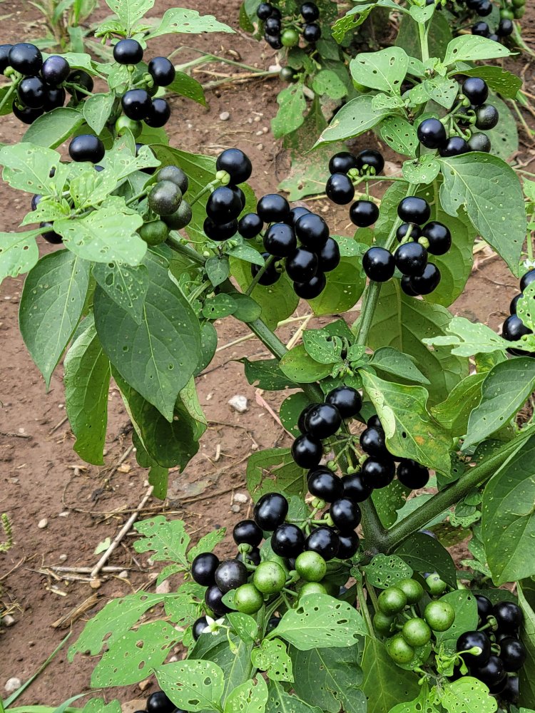 Haven't tasted the Garden Huckleberries yet; I'll harvest those in September, unless I see signs of deterioration. So far, it appears the ripe berries hold very well on the plant. When I first saw this growing on SSE's Heritage Farm, it was September; most of the leaves had fallen, and the huge clusters of shiny black berries were clearly visible on the bare branches. It was an impressive sight.