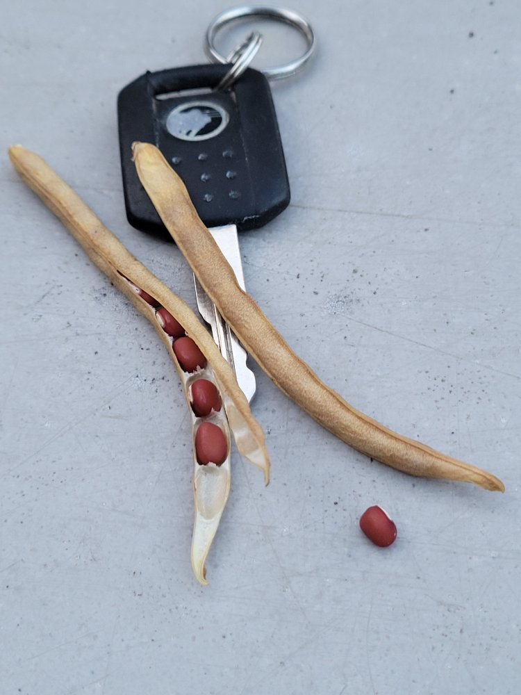 All members of the gourd family have made up for the late start. Soybeans have mostly caught up. All beans have pods & will likely get at least some dry seeds, but a few (such as "Blue Marbutt") only began flowering recently. But I picked the first dry seed yesterday; two pods of "Takara Early" adzuki beans.