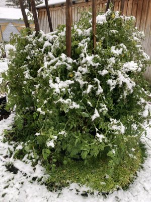 Now, for two 2022 pictures from the backyard here at home. The first, the potted tomatoes after yesterday's little snow storm.