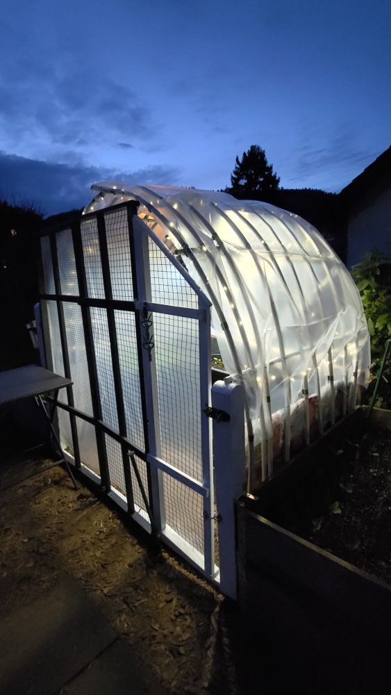 The previous ingredients in those pots for 12 months went into the last part of a backyard veggie bed. It wasn't much, about 6-8 feet dug out. The dead Gai Lan plants were pulled and added to that trench. They were what were a part of the overwintering trail and didn't make it to January. So much for brassicas having any consistent Winter hardiness :). The two, 4' x 20' beds to be covered by the hoophouse are now ready