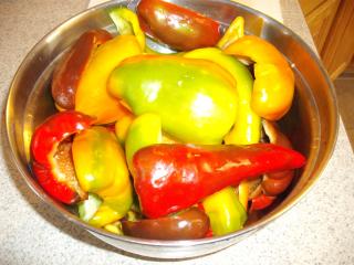 I also put up some sweet peppers. I chopped them, tray froze them, and put them in vacuum bags. Here they are before I chopped them but after they were cored and seeded.