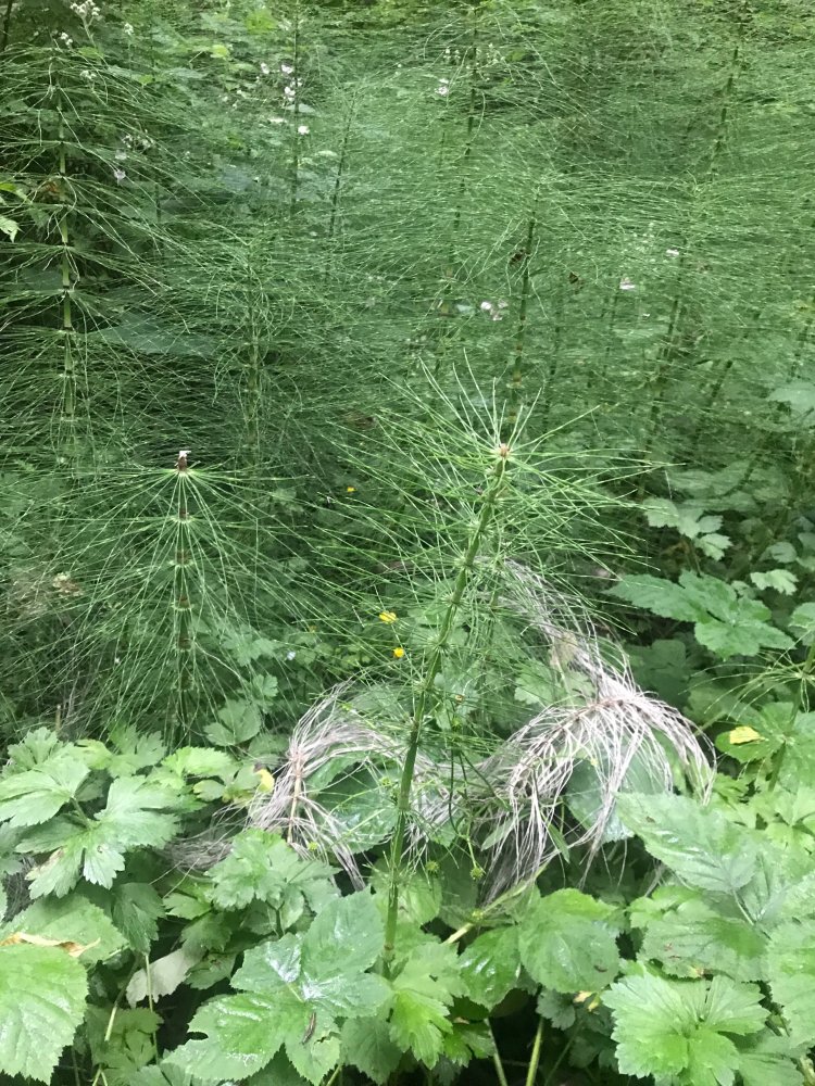 Along with the club mosses. There were two of those on GF's property as well, we called them "ground pine" and "ground cedar", because of their appearance. Those were on higher ground (usually in the leaf litter under oak trees) along with wild wintergreen.it is one of the most primitive plants still around. we have it in several places here. very hard to get rid of once it gets going.