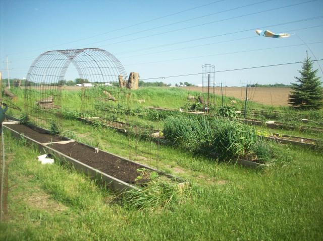 The distant black bumps are 8" black pots covered with a shovelful of dirt and covering pumpkin and squash plants. Behind the buckets are some of the 50+ tomato plants. These "containers" are here because of the 36 forecast for the day after tomorrow. I will take the large rock out of the buckets and turn them over on the tomato plants then.