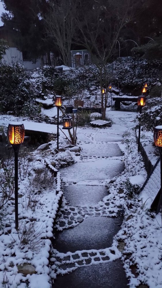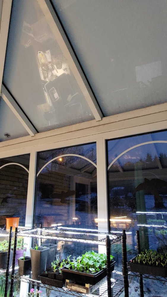 The snow has covered the greenhouse roof; thankfully, the extra lights were installed much earlier.